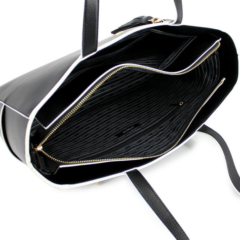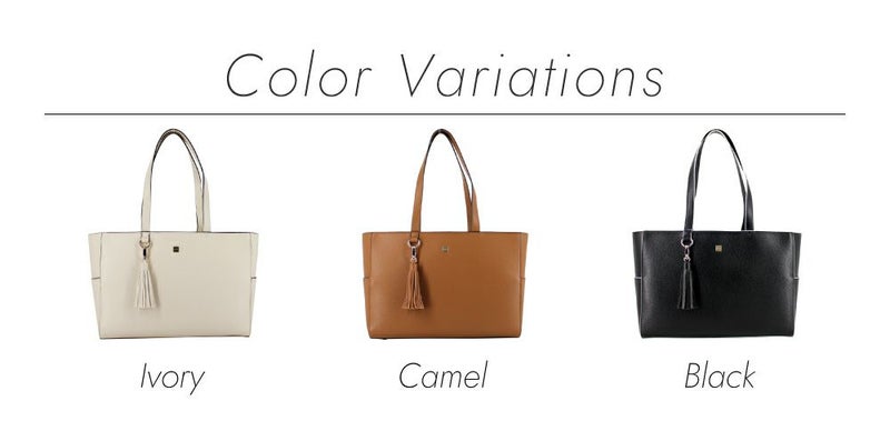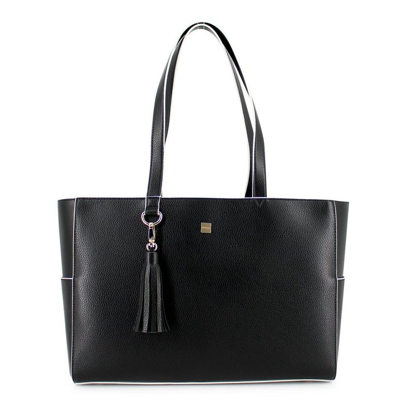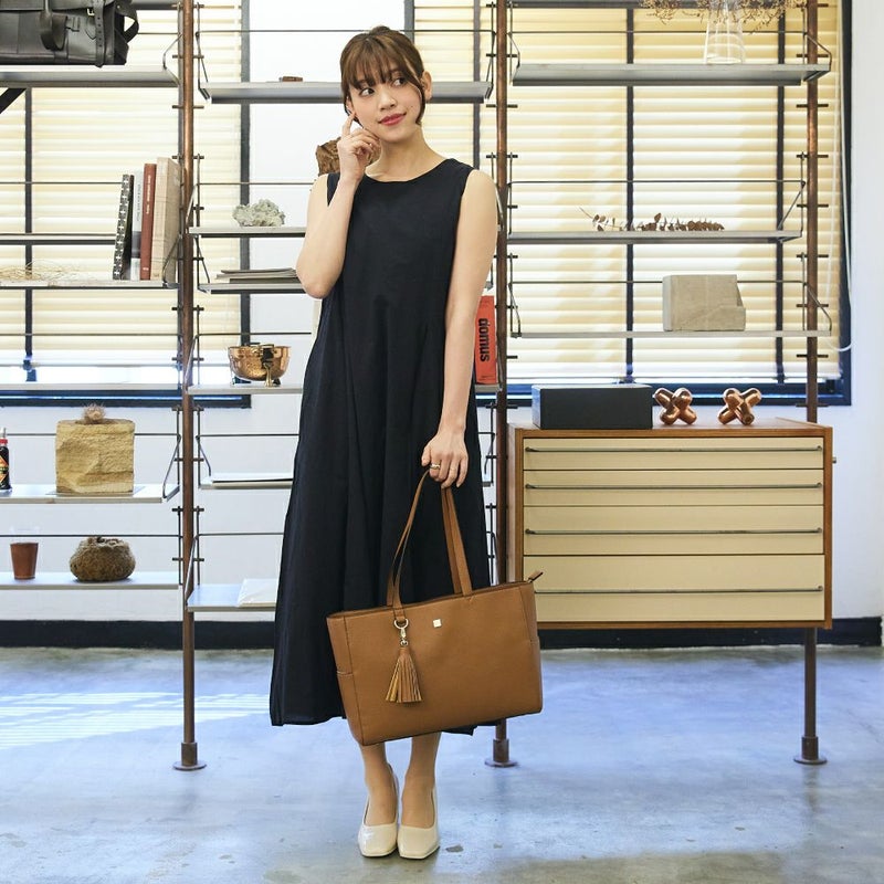 マットゴールドのスクエアメタルに配色のコバ塗りがポイントのトートバッグです。本体はキズが付きにくく高級感のあるシュリンクシボを使用。ボリュームのあるタッセルは取り外し可能です。A4書類が入るので、通勤・通学にも最適。