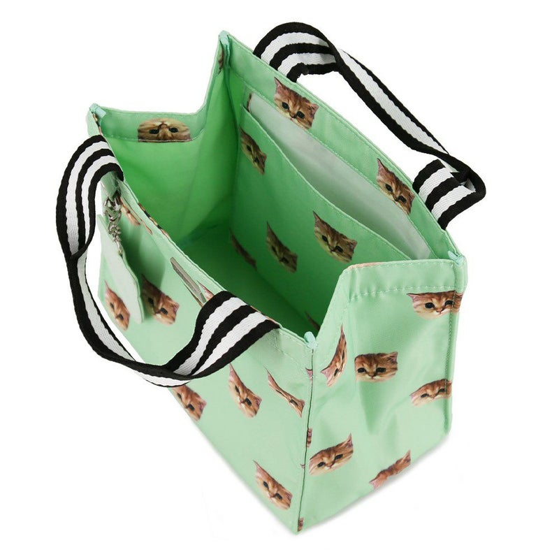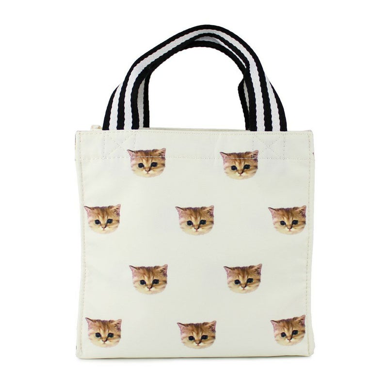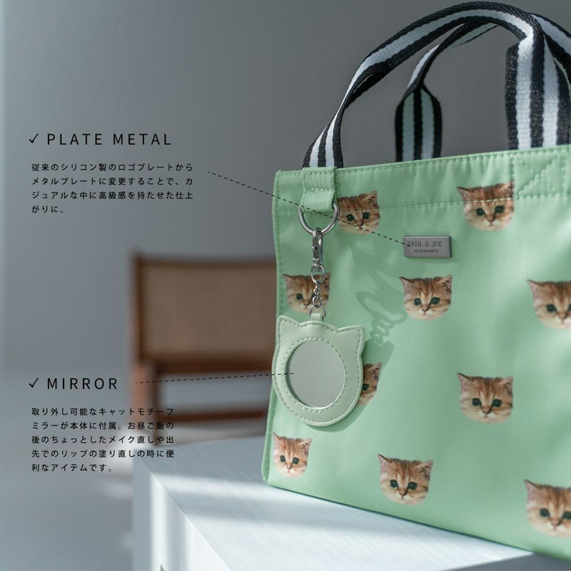 毎日過ごすランチトートをおしゃれに、HAPPYに過ごせる可愛いバッグです。内側にはフリーポケットを備え、ランチトートとしてはもちろん、サブバッグとしてのご使用もオススメです。バッグ本体には取り外し可能なネコ型ミラー付き。他のバッグに付けたり、ミラー単体でもお使いいただけます。