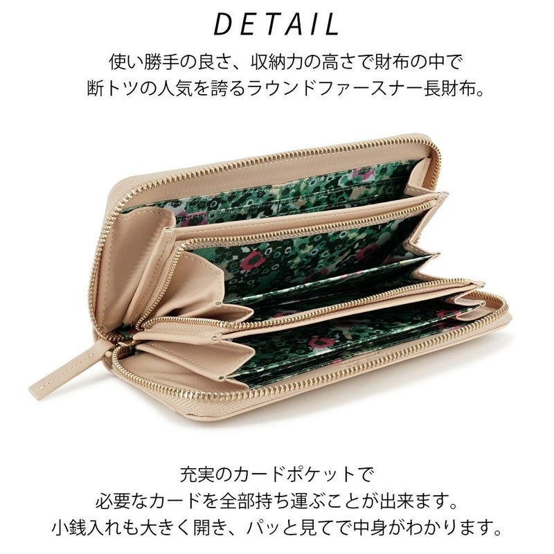 大きく開く内側に充実したカードポケットを備え、出し入れしやすい小銭入れ部分で使い勝手も抜群。ファスナーの引き手を長くする事で開け閉めしやすい仕様に。