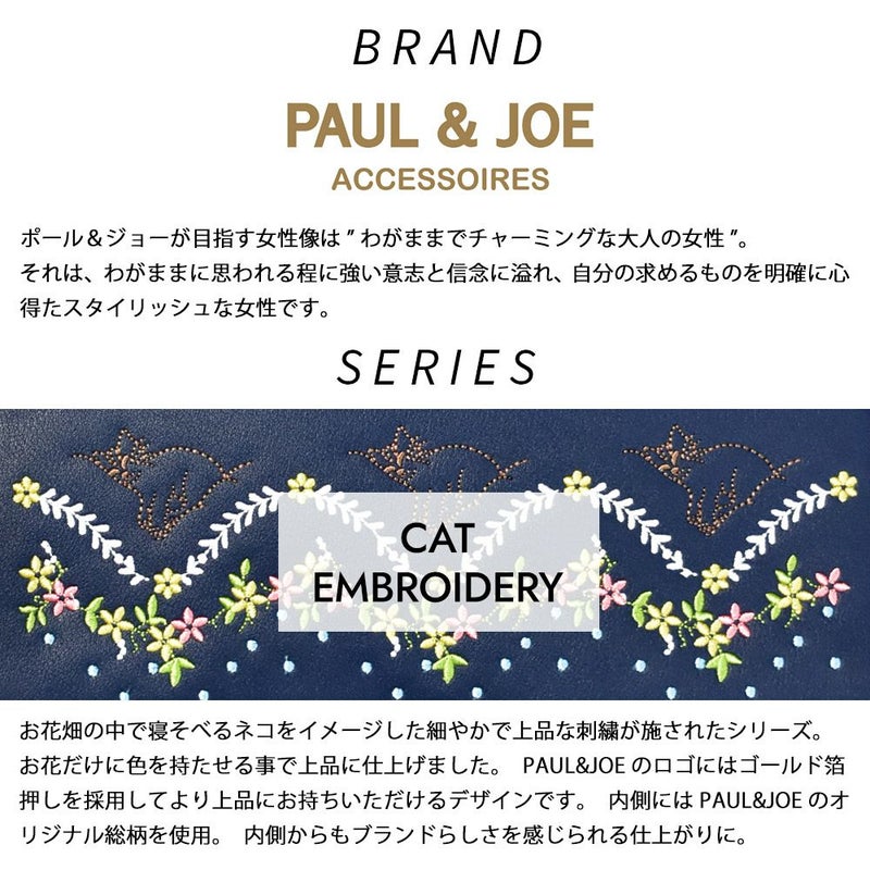 すやすや眠る猫とお花の細やかな刺繍のコンビがキュート。お花だけに色を持たせる事で上品に仕上げました。PAUL&JOEのロゴにはゴールド箔押しを採用。より上品にお持ちいただけるデザインです。