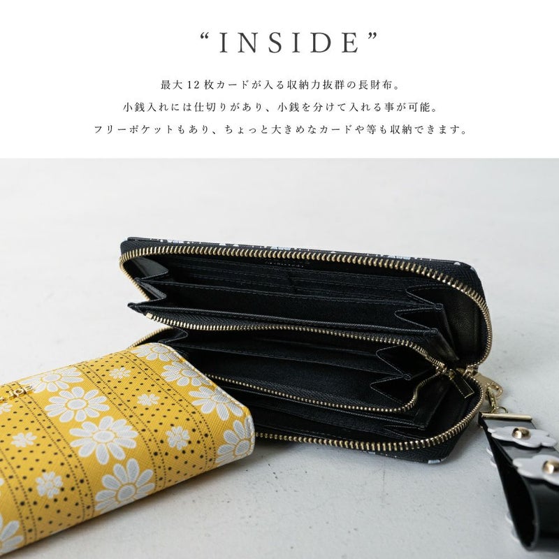 オリジナルのフラワープリント&お花のストラップが遊び心いっぱいの長財布が登場。ストラップは取り外し可能。使いやすさと充実したカードポケットが人気のラウンドファスナータイプです。
